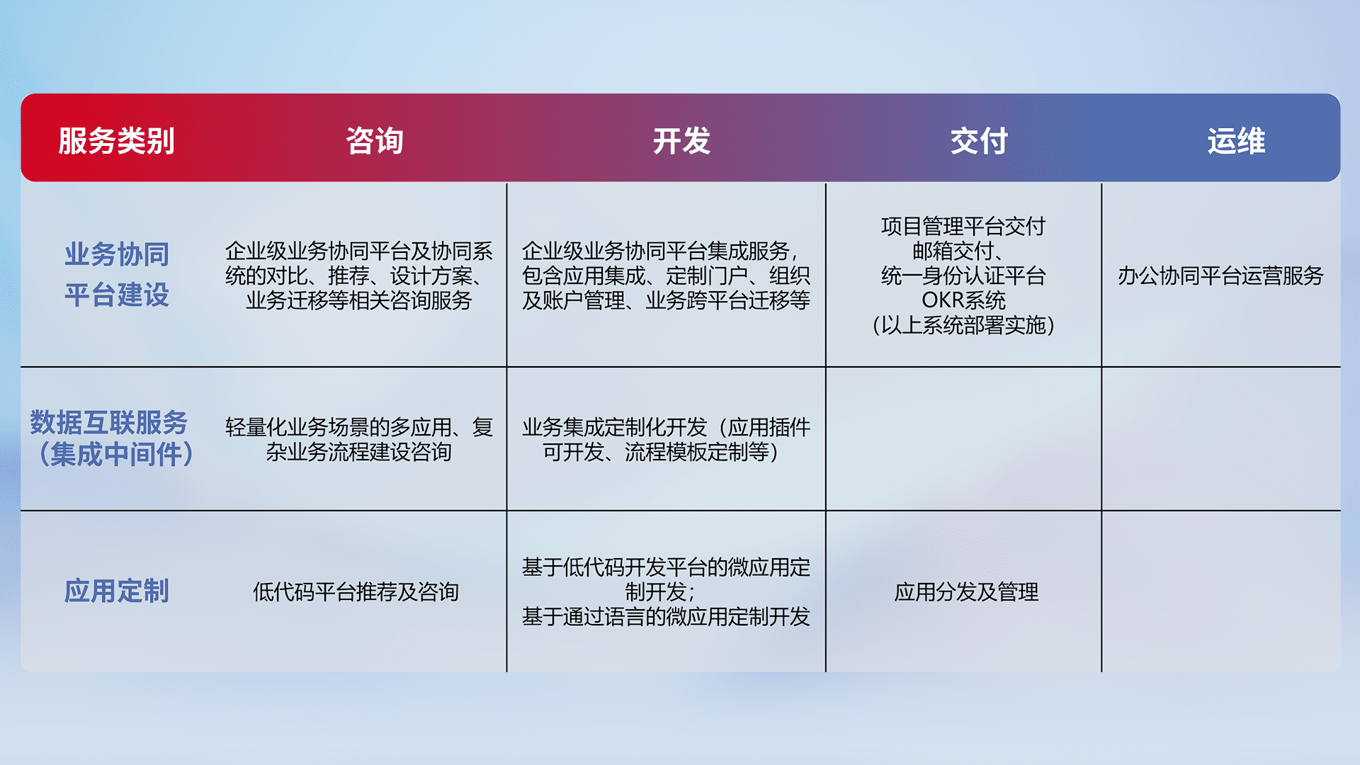针对钉钉、、、企微、、IDaas等平台级产品提供产品的规划、、、方案、、、、交付、、、、定制化开发等服务,,,,实现如统一协同办公、、智能客户服务、、、、混合会议管理、、、智能数据查询、、、等业务场景,,,实现数字化转型。。。